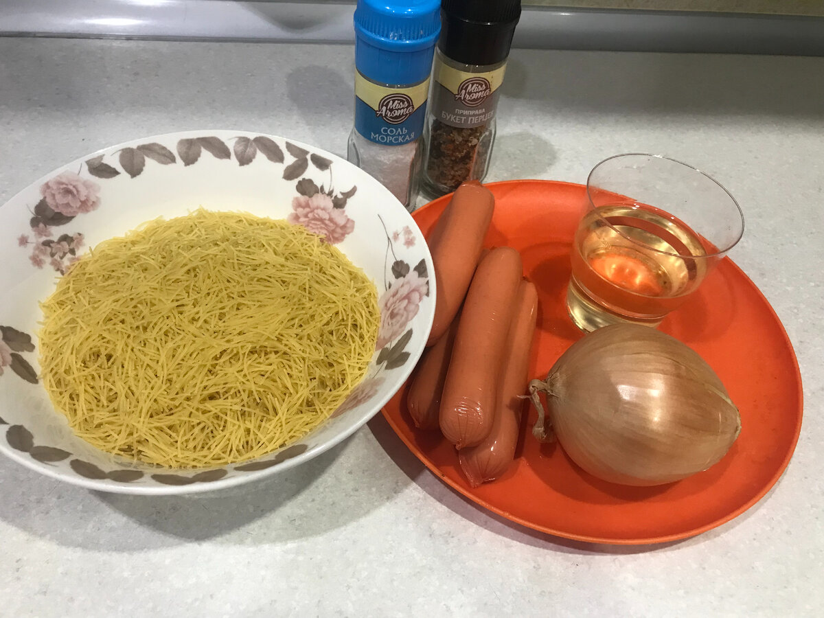 Такой способ приготовления делает вкус вермишели более насыщенным. И цвет у нее становится более ярким. Блюдо простое в приготовлении, но кажется оригинальным и новым. Начнем. Для этого блюда я взяла: 1. Репчатый лук очистила, помыла и нарезала мелкими кубиками. 2. С сосисок сняла пленку и нарезала тонкими кружками. 3. Нарезанный лук выложила в сковороду с разогретым растительным маслом и обжарила до румяного цвета. 4. Затем к луку добавила сосиски и обжарила 5 минут. 5. Разогрела вторую сковороду без добавления масла и насыпала в нее вермишель. 6. Обжарила постоянно помешивая, пока она не поменяла цвет на светло-коричневый. 7. Далее я залила к вермишели воду и одну столовую ложку растительного масла. Быстро перемешала лопаткой. 8. Готовила вермишель 5 минут под закрытой крышкой. При необходимости можно добавить еще воды. 9. Содержимое сковороды посолила и поперчила, хорошо перемешала. 10. Добавила смесь сосисок и лука, перемешала. 11. Все прогрела 3 минуты и выключила плиту