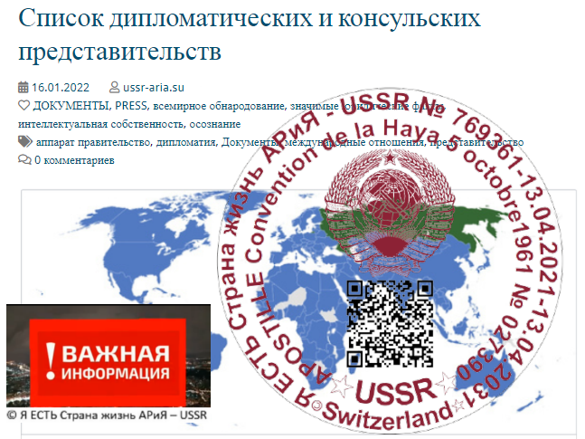 Список дипломатических и консульских представительств https://ussr-aria.su/spisok-diplomaticheskih-i-konsulskih-predstavitelstv.html МЕЖДУНАРОДНОЕ ОТКРЫТОЕ УВЕДОМЛЕНИЕ О ПОДГОТОВКЕ ОФИЦИАЛЬНОГО ЗАЯВЛЕНИЯ ОТ ©Я ЕСТЬ Страна жизнь АРиЯ – USSR – 13.04.2021- 13.04.2031 – https://ussr-aria.su/vid-na-zhitelstvo – дипломатического корпуса состоящий из 111 живых душ – https://database.ipi.ch/database-client/register/deta..