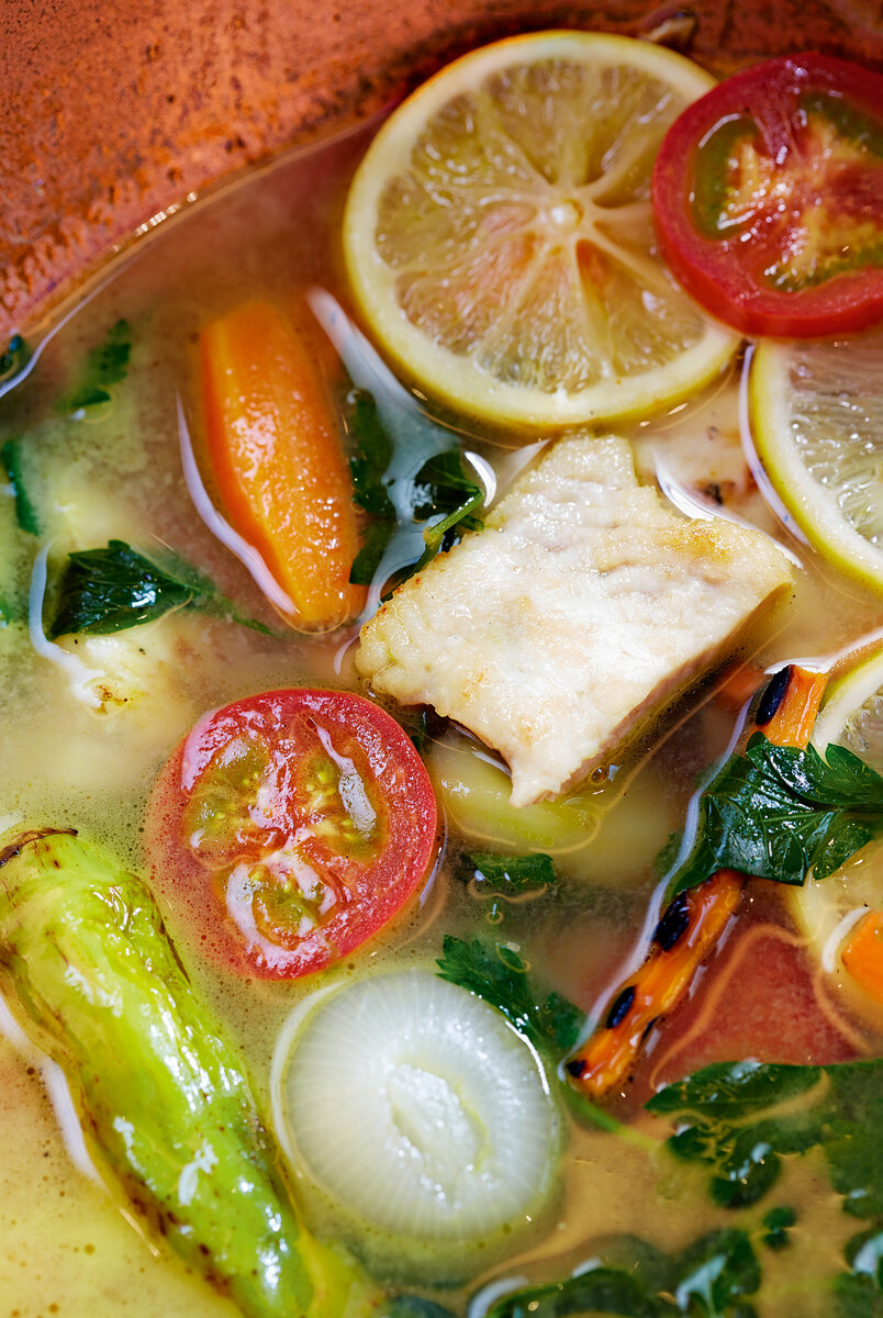 Ну а в бакинском варианте рецепт выглядит очень европейским: в бульон кладут морковь, лук, сельдерей, пучок петрушки, лимон – все то же, что и где-нибудь в Марселе. Не забываем время от времени снимать с бульона пенку, но можно себе позволить обойтись без оттяжки, водяной бани и прочих хитростей, к которым прибегают хозяйки, чтобы суп вышел прозрачным и золотистым (оттяжка, если вы не знали, это раствор из яичных белков, который, будучи влитым в бульон, сворачивается и «оттягивает» на себя всю муть и хлопья). Наш суп из каспийского осетра и без того получается красивого золотого оттенка. А в последний момент мы добавляем в него – бакинский секрет! – щепотку куркумы. Пока бульон настаивается, заранее срезанное филе обжариваем на сливочном масле, за ним – морковь, помидор, сладкий перец, половинку лимона. К этому моменту все домашние уже подтягиваются к столу, даже звать не приходится. Остается только разложить рыбу и овощи по тарелкам и залить профильтрованным горячим бульоном.
