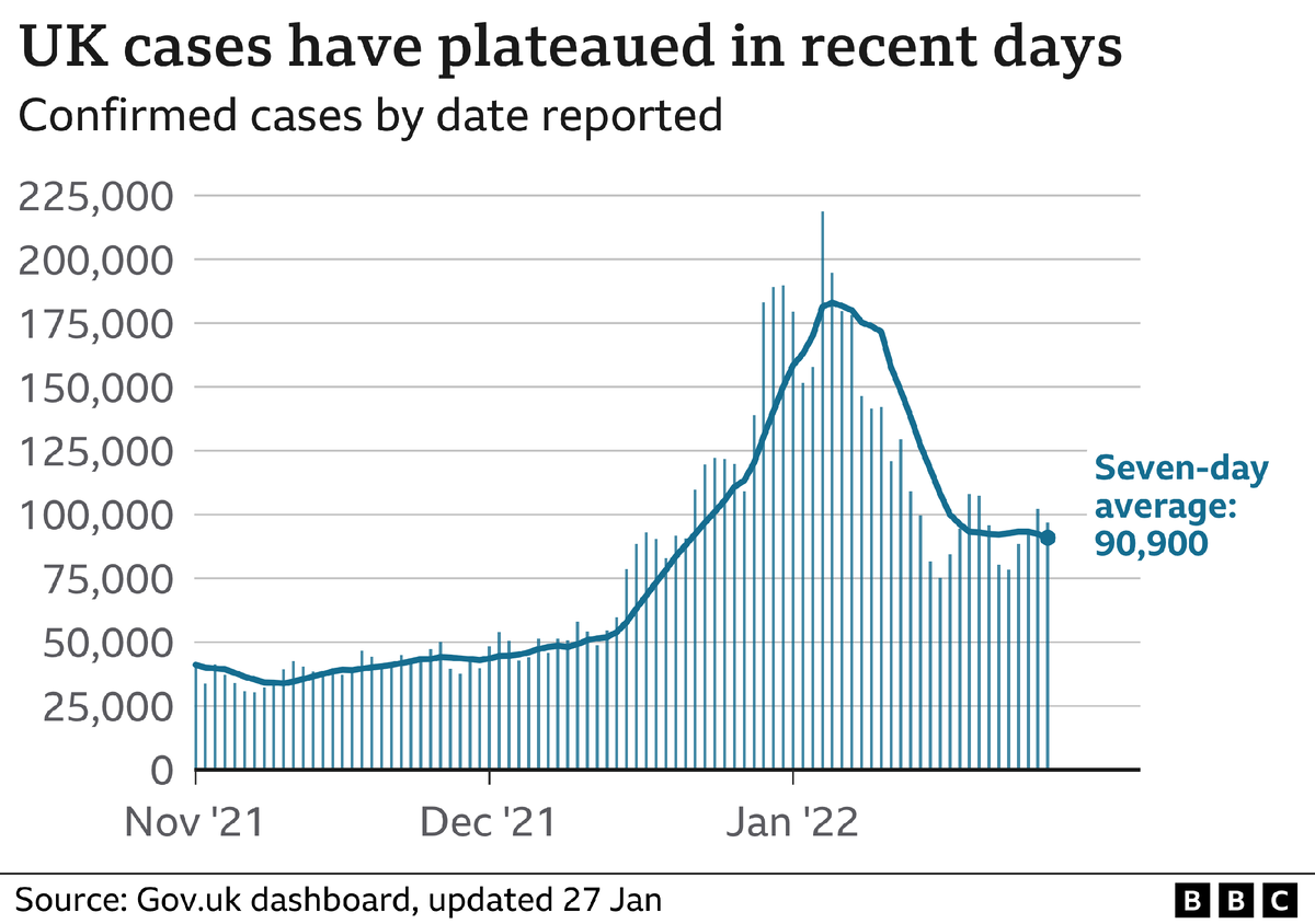 BBC, 28.01.2022 BBC публикует данные об Omicron в Великобритании и сравнивает их с данными в других европейских странах. Во-первых, отмечается, что Великобритания предположительно вышла на плато по заболеваемости: после пика заражений в 20-х числах января и их последующего постепенного снижения количество заражений в течение семи дней держится примерно на уровне 91000 случаев. При этом количество смертей держится на уровне менее 300 в день. Во-вторых, наблюдается перераспределение числа заражений среди возрастных групп. Группа 60+ сейчас находится в самом низу графика, а наиболее работоспособные группы от 20 до 29 и от 30 до 44, наоборот, пробивают потолок. В-третьих, количество смертей с апреля по декабрь 2021 значительно уменьшилось. Это связано 1. с повышением иммунитета за счет вакцинации, ковидных ограничений и соблюдением профилактических мер, 2. с особенностями штамма омикрон — более высокой контагиозностью и более низкой сопротивляемостью вакцинам. Большие надежды также возлага