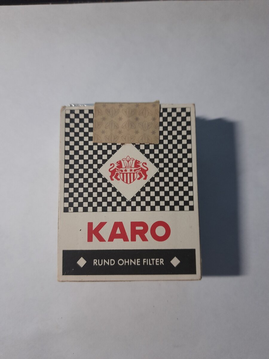 Доброго времени суток всем! Сегодня речь пойдёт о немецких сигаретах под названием Karo. Производились они с 1960х годов, стоили недорого, ну и естественно были сигаретами низкого класса, как Прима, Шипка и прочие, тобишь народными. Оформление пачки самое простое, выполненное в стиле шахматной доски, название переводится, как: бриллиант, ромб и т.п. Выпускали на бывшей фабрике Дрездена. Перейдём к разбору. Встречают нас сигареты в мягкой пачке, где находится 19 сигарет, а не 20, как обычно, что странно. На боковой стороне информация о фабрике, где были произведены сами сигареты, с другой написано название. Сверху на бумажку нанесена информация о кол-ве сигарет в пачке. На дне выбита дата изготовления 10.01, а вот год нет. Из пачки встречает классическая сигарета без фильтра, название и рисунок на самой бумаге. Итак, переходим к курению. Изначально, ожидал классический вкус вирджинии, но встречает мешка из копчёных табаков, темного цвета, без светлых вкраплений. Во вкусе некий гибрид