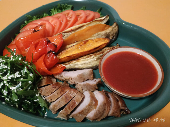 Запечённые овощи (баклажан, перец, батат), свежий помидор. Салат: рукола, сбрызнутая лимоном, оливковым маслом и присыпанная кунжутом для декора. Телятина, быстро обжаренная с двух сторон для сочности, и далее запечённая с овощами в духовке. Овощи и телятину запекала при 200 градусах минут 25, не меньше (точно не засекала). Клюквенно-томатный соус. 1 стакан томатного сока, 3-4 столовых ложки клюквы, 2 ст. ложки красного сухого вина. Довести до кипения и варить на маленьком огне около 10 минут, затем разбить до состояния пюре (я это делаю погружным блендером) и протереть через мелкое сито. Полученную массу прокипятить ещё 1 минуту, добавив соль, специи, какие вы любите (я добавляю только немного перца чили) и 0,5 ст.л. эритрола (или другого сахарозаменителя). Батат всем не рекомендую, но лично мне очень даже зайдет! Зовите того, кого"не хватает" - порции легко хватит и на двоих 🙂 Больше общения и рецептов - в группе "Жизнь с диабетом" в Facebook! Рецепт на странице в Facebook Автор ре