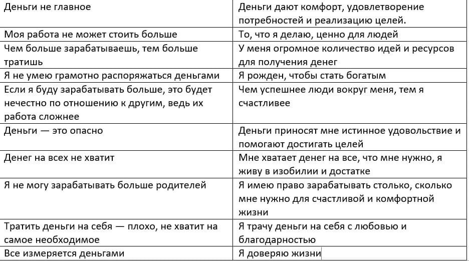 Замечали ли вы такое: вроде постоянно работаете, а денег все равно нет. Или только получили оплату за большой проект, а в конце недели понимаете, что все потратили. Куда — непонятно. Почему так происходит? Стиль вашего поведения диктуют денежные установки. Что это и как от них избавиться — поговорим в этой статье. Поехали! Что такое денежная установка? Установка — это видение ситуации человеком, которое считается единственно верным и принимаем за истину в последней инстанции. Даже если на деле это не так. Откуда берутся денежные установки? 97% установок идёт из детства. Образ жизни, атмосфера в семье, суждения родителей, бабушек и дедушек — все это откладывает отпечаток на мышление. Как их проработать? Сегодня я хотел бы предложить вам сделать упражнение. Ниже приведен список из 20 установок. Важно! Отвечать нужно честно. Этот тест для вас, не для меня. Прочитайте их и отметьте галочкой те, которые у вас есть, затем выполните расчет . Теперь нужно посчитать убеждения из левого столбика
