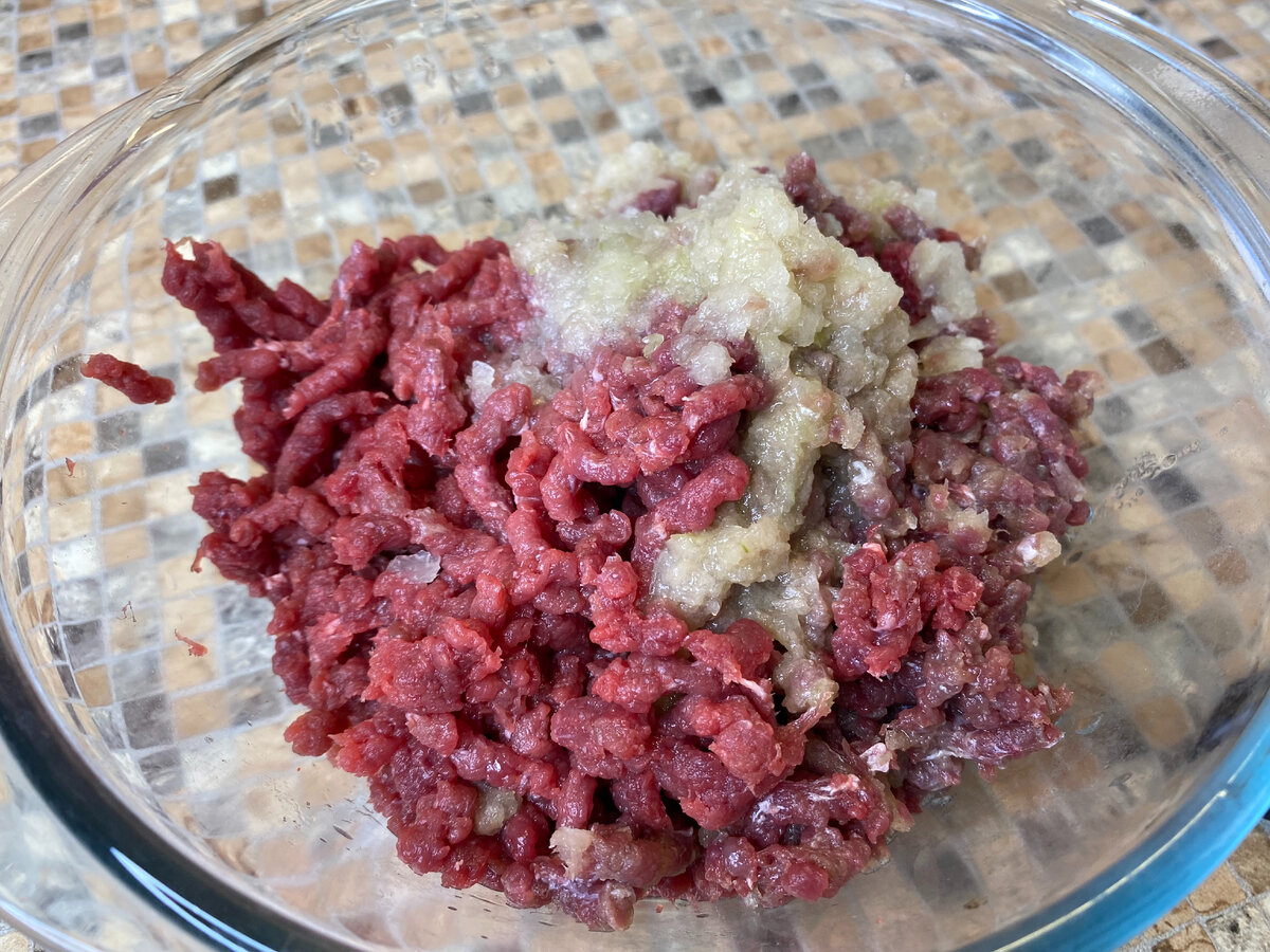 Итак, фарш прокручиваем (или покупаем готовый) и добавляем внутрь лук. Я прокрутил его через мясорубку вместе с фаршем, но можно просто мелко нарезать.