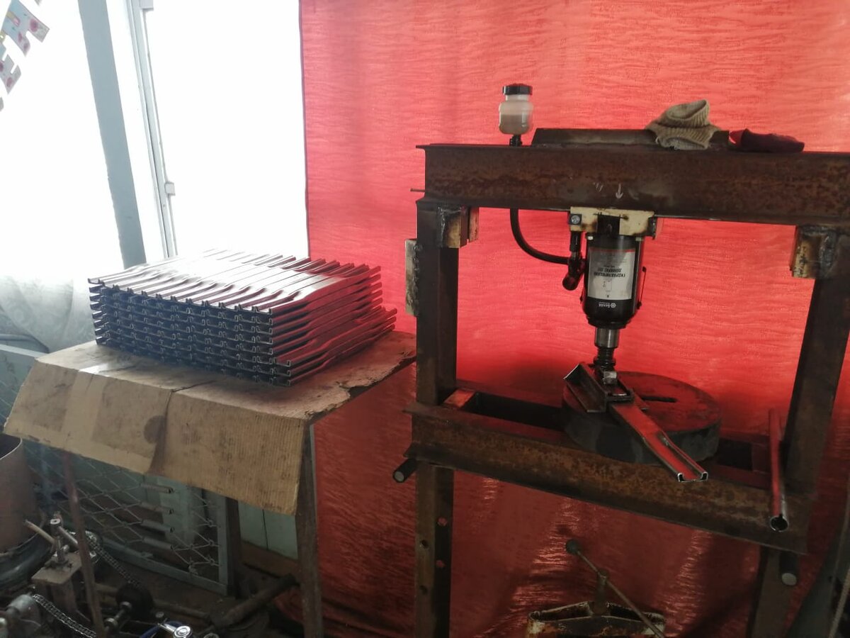 Прежде чем начать делать гусеничный вездеход, нужно сделать приспособления с помощью которых будут создаваться детали вездехода. Для изготовления траков на гусеницы был создан самодельный гидравлический пресс на двадцать тонн. Для получения нужной формы был изготовлен кондуктор. Благодаря этим приспособлениям было создано 100 траков, по пятьдесят на каждую гусеницу. В другом специальном кондукторе были приварены клыки, удерживающие гусеницу, чтобы не слетела. Перед тем как варить клыки, на плоской специальной "линейке" помечал отверстия, потом бил бородкой - кернил, а потом сверлил отверстия. Сверло "Атака"- все 400 отверстий просверлил им и ни разу не точил сверло. Конечно, старался не перегревать, рядом стояла колбочка с маслом и периодически во время работы окунал туда сверло и сверлил дальше. Для того, чтобы понять расстояние между траками, необходимо изготовить ведущие звезды. Для изготовления ведущих звезд был взят штампованный диск, у него обрезаны края и он был обварен листовы