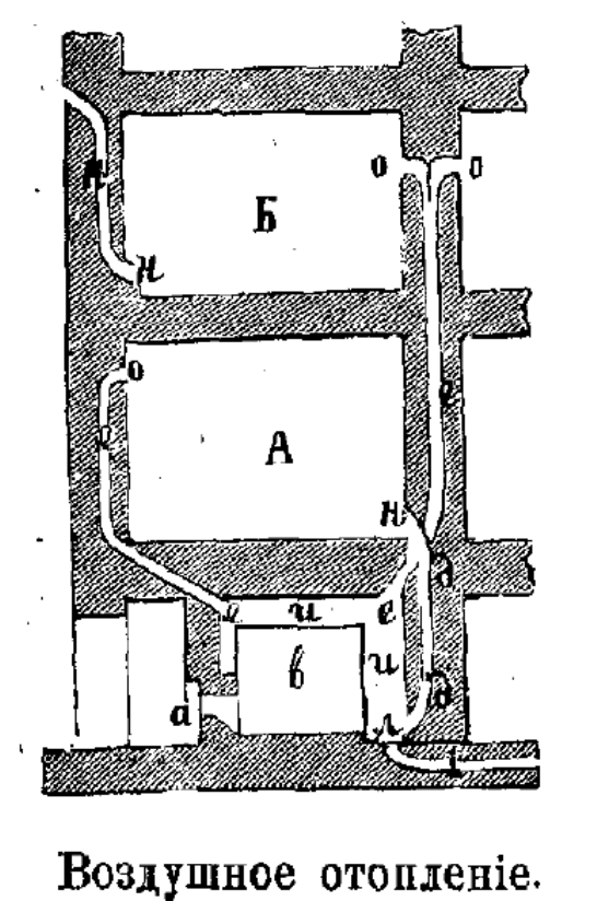 Для создания воздушного отопления печи помещали в подвальном помещении в специальной тепловой камере с толстыми стенками в 2,5-3 кирпича. Это делалось для того, чтобы максимально сохранить тепло от печи (в), находящейся в этой камере (ии). Вход к печи в подвале делали с улицы, обычно с двумя дверями и тамбуром. Воздух нагреваемый в камере поднимался в помещения по духовым каналам (ее) и через душники (ооо) передавался в комнаты на разных этажах здания. Охлажденный воздух поступал обратно в камеру по каналам (дд для комнаты А), где снова нагревался и поступал обратно в помещения или выпускался наружу (через канал к для комнаты Б). В случае закрытого циркулирования воздуха внутри дома на его обогрев тратилось меньше топлива, чем при применении простых печей. Внутри камеру обмазывали глиной с солью или обкладывали изразцами. Духовые каналы (ее) делались в своде тепловой камеры, а приточные (i,дд) в нижней ее части. Горизонтальные духовые каналы не рекомендовали вести более 6 метров и след