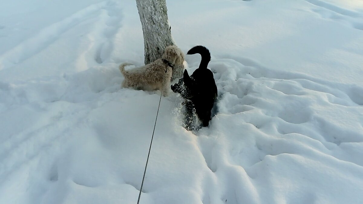 Дашка радостно понеслась по снегу, потом, почти моментально, вернулась обратно и стала снова приставать к Грейс — «давай поиграем!» — за что опять получила люлей. Типа рано еще. Сперва надо всё понюхать, разнюхать, проверить надо, дела сделать, в конце концов, потом уже можно и поиграть.