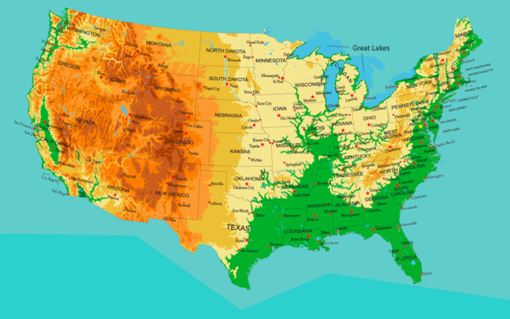 Судя по названию, там должно было происходить нечто ужасное. Какое-то массовое вымирание, эпидемия или масштабная битва, наподобие Сталинградской или Курской. Но нет, Американцы, как обычно, нагнали жути, приклеили красивую этикетку и теперь туристы со всего мира приезжают удовлетворить свое любопытство – что же это за долина с таким кричащим названием? Для начала, давайте посмотрим, где она вообще находится и что из себя представляет. Интересная география На физической карте хорошо видно, что США как бы разделены на две части – более плодородный, равнинный восток и гористый, засушливый запад. При этом, в западной части среди гор виднеются различные долины. Самая большая и заметная – Калифорнийская. К востоку от нее лежит знаменитый город развлечений и казино – Лас-Вегас. Так вот, Долину Смерти найти довольно легко – она лежит как раз по дороге из Калифорнийской долины в Лас-Вегас. На карте она виднеется как маленькое зеленое пятнышко: Впрочем, "маленькое" и "зеленое" – не лучшие опре