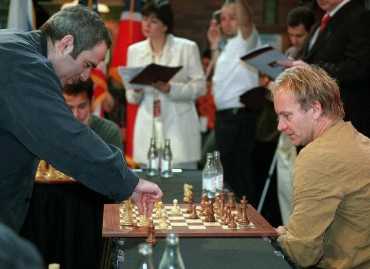 Стинг играл в шахматы с гроссмейстером Гарри Каспаровым. Певец вместе со своей группой принял участие в показательном матче против гроссмейстера в 2000 году в Нью-Йорке. Это был сеанс одновременной игры. Каспарову понадобилось всего 50 минут, чтобы обыграть всех пятерых музыкантов.