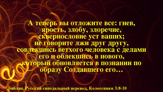 «А теперь вы отложите всё: гнев, ярость, злобу, злоречие, сквернословие уст ваших; не говорите лжи друг другу, совлёкшись ветхого человека с делами его» (Кол. 3:8, 9).