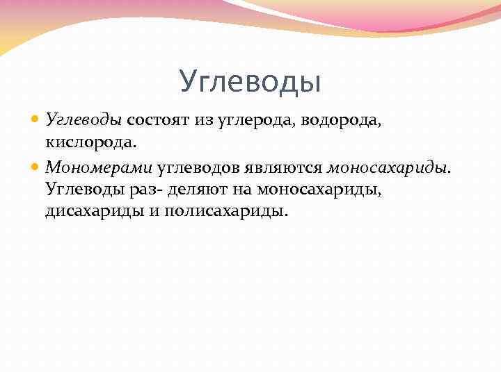Углеводы- это один из трёх важных элементов питания как жиры и белки. С ними не всё так легко, нужно уметь правильно их употреблять чтобы похудеть или получить любой результат к которому вы стремитесь. Углевод состоит из воды и углерода. Благодаря этому человек получает необходимую энергию. Если вам недостаёт углеводов, то начинается распад жиров и белков. Начинают накапливаться токсины. Польза углеводов: 1. Обеспечивает оптимальную работу сердца, нервной системы, мышечных тканей, печени и пищеварительной системы. 2. Регулируют процесс обмена жиров и белков. 3. Обеспечивает работу головного мозга, глазного яблока. Различают четыре типа углеводов: 1. Моносахариды . Не распадаются на более . Это глюкоза и фруктоза. 2. Дисахариды . Уже это сложные соединения из двух простых простых. Например лактоза и сахароза. 3. Олигосахариды. Несколько моносахаридов. 4. Полисахариды. Самые сложные соединения. В каких продуктах содержатся углеводы: Список очень большой, но не все они один