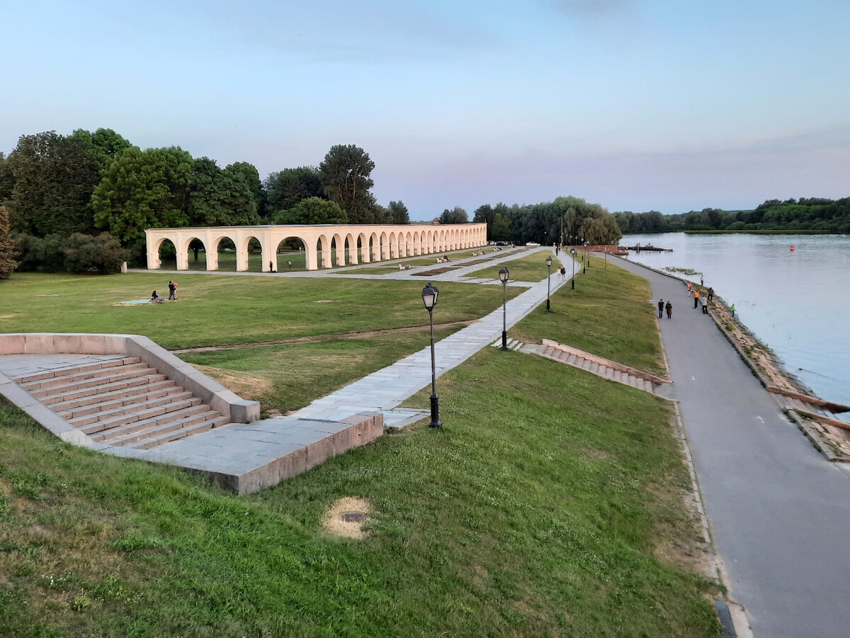 Представим, что Вы стоите на мосту через реку Волхов . Справа, через реку, будет Кремль. А слева - торговая сторона. Сходим с моста и идем по дорожке до конца арок.