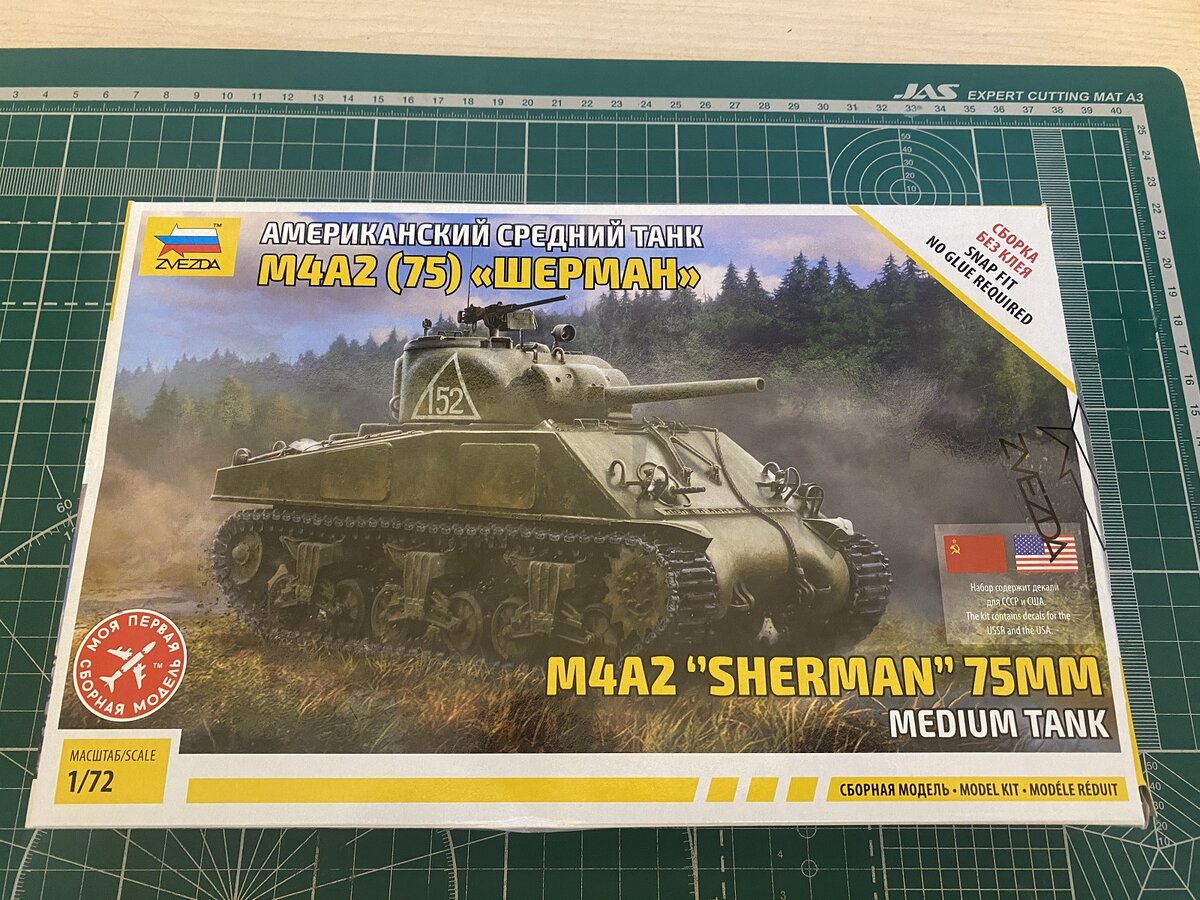 Всем доброго времени суток! Что-то благодаря "Звезде" подсел я на "Шерманы". Ранее я уже обозревал сборные модели этого танка в масштабе 1/35: И вот решил приобрести в коллекцию этот же танк в абсолютно не типичном для себя масштабе, благо цена совсем не высока. Итак, сегодня у меня небольшой обзор на недавнюю новинку от лобненской компании "Звезда" - Американский средний танк M4A2(75) "Шерман" в масштабе 1/72 (Арт. 5063). Есть у "Звезды" такая серия, называется "Моя первая сборная модель". Т.е. подразумевается достаточно простой набор для начинающих моделистов, который собирается даже без клея, на защелках. Вот и этот "Шерман" из этой же темы. На обратной стороне коробки фотографии собранной, но неокрашенной модели танка. А также информация, о том что набор состоит из 120 деталей (ну нормально так для 1/72 масштаба). Открыв коробочку обнаруживаем заботливо упакованные в общий пакет те самые 120 деталей из светло серого пластика. Литников немного, а именно три. Выше представлен литник