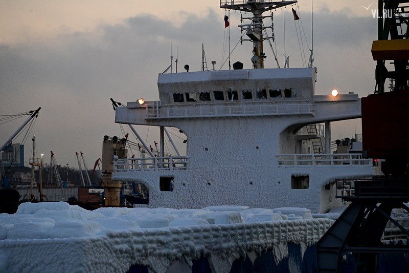 Сухогруз с жарким названием «Sun Rio» доставил во Владивосток партию свежемороженых иномарок Некоторое время назад в сети появились фотографии обледеневшего сухогруза, везущего в Россию подержанные японские автомобили, покрытие слоем льда. Сегодня, 27 декабря, судно «Sun Rio» зашло во Владивосток. Фотографии не обманывали – палуба, все надстройки и, конечно, автомобили покрыты ледяным панцирем. Смотреть на это любопытно и одновременно больно. Машины покрыты слоем льда от нескольких см до нескольких десятков см. Лишь местами можно угадать марку авто под этой ледяной глазурью. Большая же часть иномарок просто неопознаваема. Судно стало под разгрузку возле Морского вокзала, в самом центре Владивостока. Его отлично видно с берега, чем пользуются горожане, фотографируя необычный груз. Иронично не только жаркое название судна «Sun Rio»(«Солнечный Рио»), но и флаг Панамы. Вряд ли в этой субэкваториальной стране когда-либо видели подобное. Впрочем, судно построено в Японии в 1991 году, х