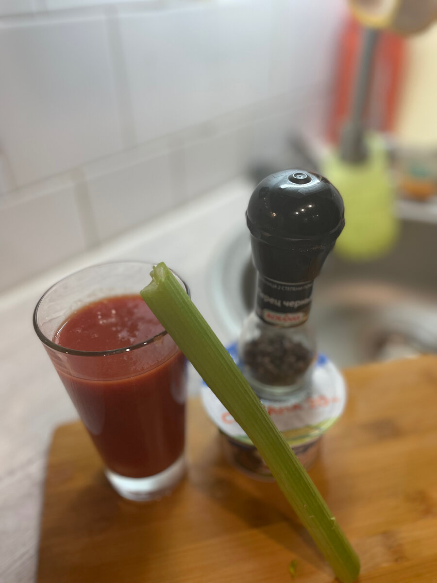 Всем привет друзья, хочу вас познакомить с рецептом томатного коктейля, который научил меня отец. Все очень просто а главное полезно. Ингредиенты: томатный сок, сметана, чёрный перец, щепотка соли и корень сельдерея! В стакан сока добавляем немного соли, перец по вкусу, две ложки Сметаны. Все это перемешивам и получаем очень вкусный а главное полезный напиток который содержит миллион витаминов и бета-каротина! Прикусываем все это корнем сильдирея всем приятного аппетита