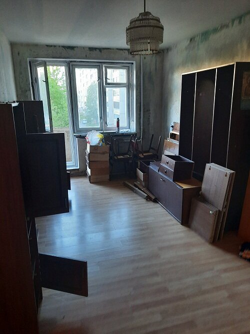 Так выглядела комната до ремонта. Ламинат на полу прогибался, из-за неровностей основания. Вся комната была завалена мебелью. Окно также было не заменено.