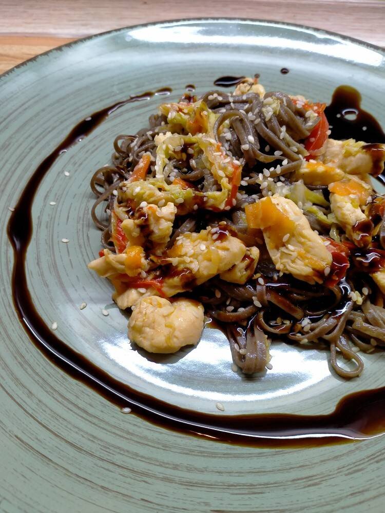 Соба с курицей и овощами, соба с овощами вок и пекинской капусты. Национальная японская лапша из гречневой муки в сочетании с обжаренными овощами, курицей и специями даёт неповторимый вкус. Всем рекомендую попробовать. Ингредиенты: соба (гречневая лапша), филе куриное, морковь средняя, перец сладкий болгарский крупный, лук средний, капуста пекинская, корень имбиря, кориандр, соус соевый, соус устричный, оливковое масло (растительное), перец Чили (по желанию), кунжут для подачи, лук зелёный для подачи, бальзамик соус для подачи Способ приготовления: Раскалить сковороду (а лучше использовать Вок) с оливковым маслом, добавить имбирь и чеснок нарезаем тонкой соломкой, кориандр. Филе нарезать полосками, практически сразу добавить в сковороду и поджарить до румяной корочки со всех сторон (5-7 минут). Лук нарезаем полукольцами, перец болгарский соломкой, морковь тонкими слайдами (удобно использовать овощечистку), перец Чили колечками (по желанию). Отправляем в сковороду. Огонь не уменьшаем!!