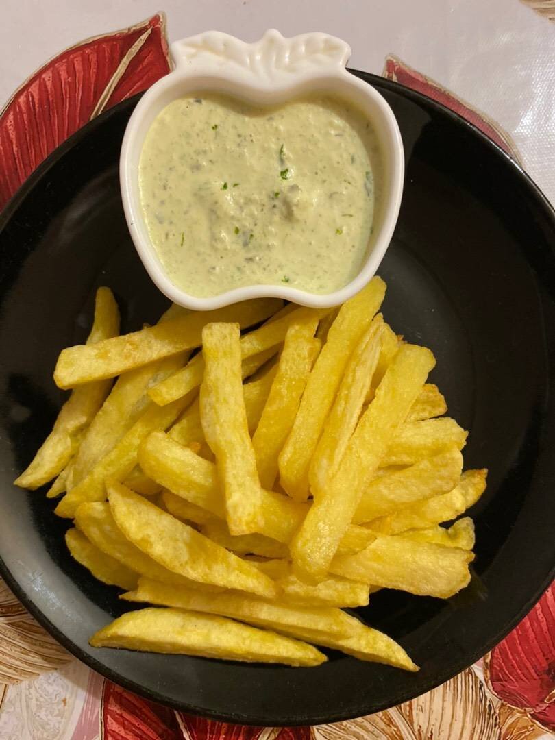 Картошка фри мне нравится только домашнего приготовления, а соус Тартар подойдёт не только к фри). Ингредиенты: Картофель крупный, Масло растительное, Огурец маринованный, Чеснок, Зелень, Сметана , Майонез Способ приготовления: Картофель чистим и нарезаем на крупные бруски, промываем, замачиваем на 10 минут в ледяной воде, затем выкладываем на ткань для просушки от влаги. В мультиварке разогреваем растительное масло и на сетке опускаем картофель! У каждого мультиварки разные и количество картофеля тоже разное, поэтому время приготовления ищите у себя в инструкции! Можно и в кастрюле на газу приготовить, тоже получается очень вкусно. В это время в чашу блендера кладём сметану, майонез, чеснок, зелень (у меня это лук) и маринованный огурчик, измельчаем приблизительно 3 минуты, мощность моего блендера небольшая, поэтому мне понадобилось такое время. Готовый картофель выкладываем в чашу застеленную бумажными полотенцами, чтоб впитались излишки масла, присыпаем мелкой солью по вкусу. Наша н