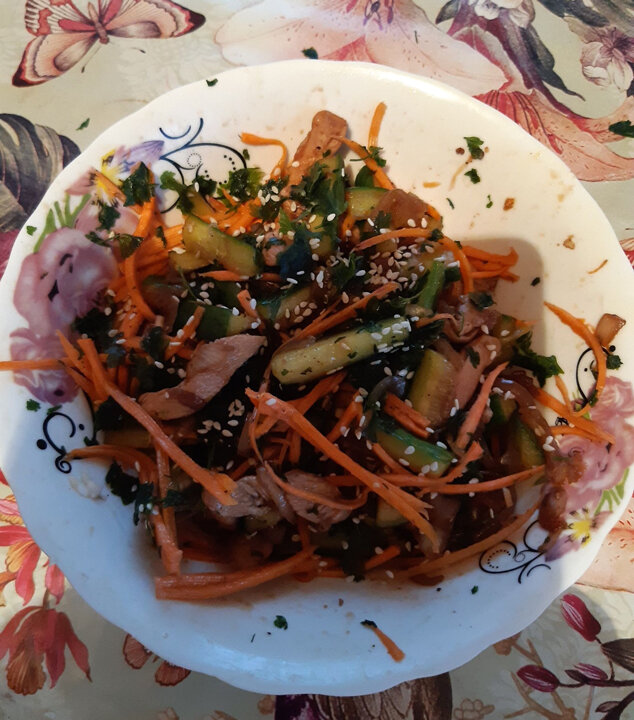 Куриную грудку, нарезанную небольшими кусочками, обжарить на сковородке вместе с луком. Свежий огурец, морковь, чеснок, специи (кориандр, перец черный, соевый соус, уксус и петрушка). Можно добавить свежий болгарский перец. Всё посыпать кунжутом (но можно и без него). Приятного аппетита! Больше общения и рецептов - в группе "Жизнь с диабетом" в Facebook! Рецепт на странице в Facebook Автор рецепта - Марина Володкина