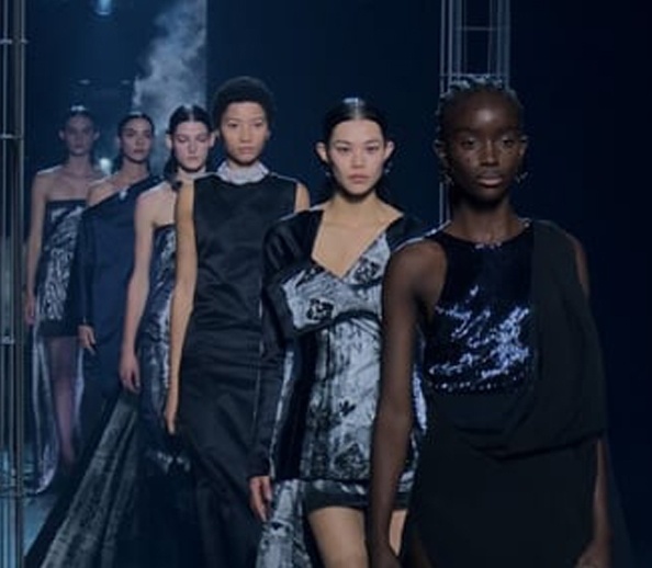 Здесь был более гладкий и резкий Fendi с пылающей Софией Стейнберг, открывающей выставку в Palais Brogniart, светящиеся очертания разбитого храма, парящие в темноте. Она ворвалась через узкий, наполненный дымом портал в блестящей черной колонне с боковой щелью, ее узкие ряды трубчатых бусин отражали свет таким образом, что это выглядело почти пиксельным.