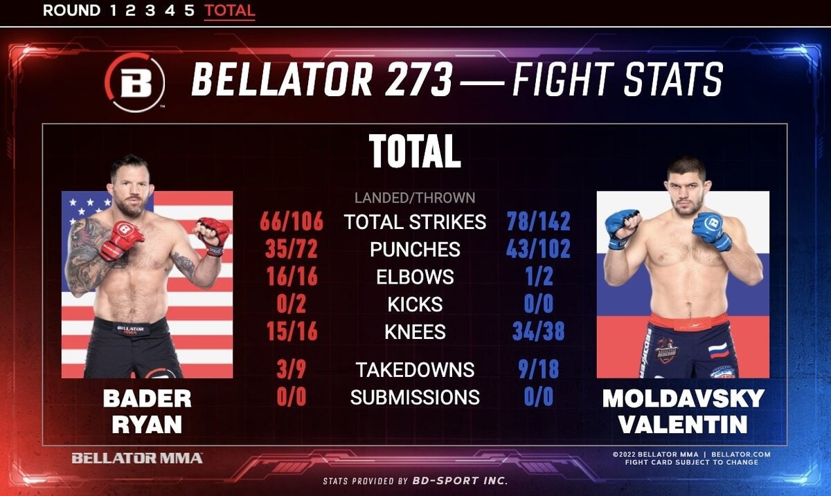 📝 Результаты #Bellator273 Райан Бейдер победил Валентина Молдавского единогласным решением (48-47, 48-47, 48-47) и сохранил титул в тяжелом весе Бенсон Хендерсон победил Ислама Мамедова раздельным решением (29-28, 28-29, 29-28) Генри Корралес победил Эйдена Ли единогласным техническим решением решением (29-28, 30-27, 30-27) Сабах Хомаси победил Джалила Уиллиса удушающим приёмом (arm-triangle choke) – (Раунд 1, 1:42) Энрике Барзола победил Дэрриона Колдуэлла техническим нокаутом (Раунд 3, 3:01) Крис Гонсалес победил Саада Авада нокаутом (Раунд 1, 0:36) Далтон Роста победил Дуэйна Джонсона единогласным решением (30-27, 30-27, 30-27) Никита Михайлов победил Блэйна Шутта техническим нокаутом (Раунд 3, 3:23) Лукас Бреннан победил Бенджамина Луго удушающим приёмом (arm-triangle choke) – (Раунд 1, 2:27) Салливан Коули победил Бена Пэрриша техническим нокаутом (Раунд 1, 4:35)