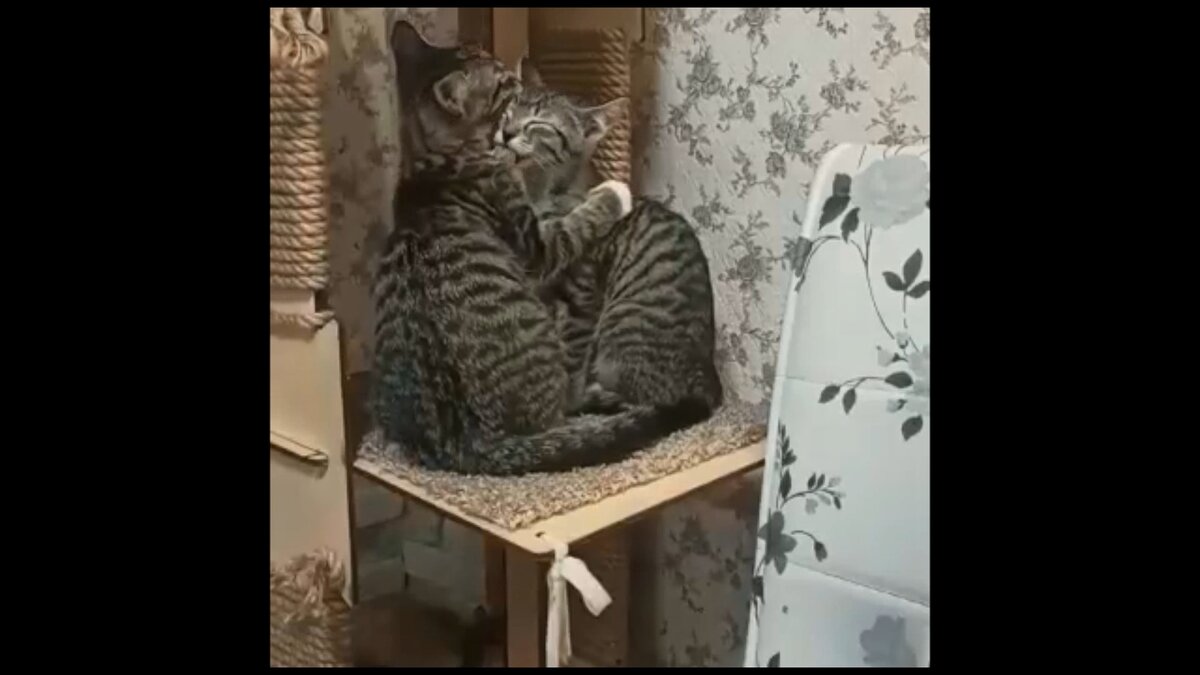 Симба и Бонита сидели и вылизывались на своей кото-башне под звуки из какого-то сериала. Получилось удачно. Про булку с кремом, правда, не совсем понятно.