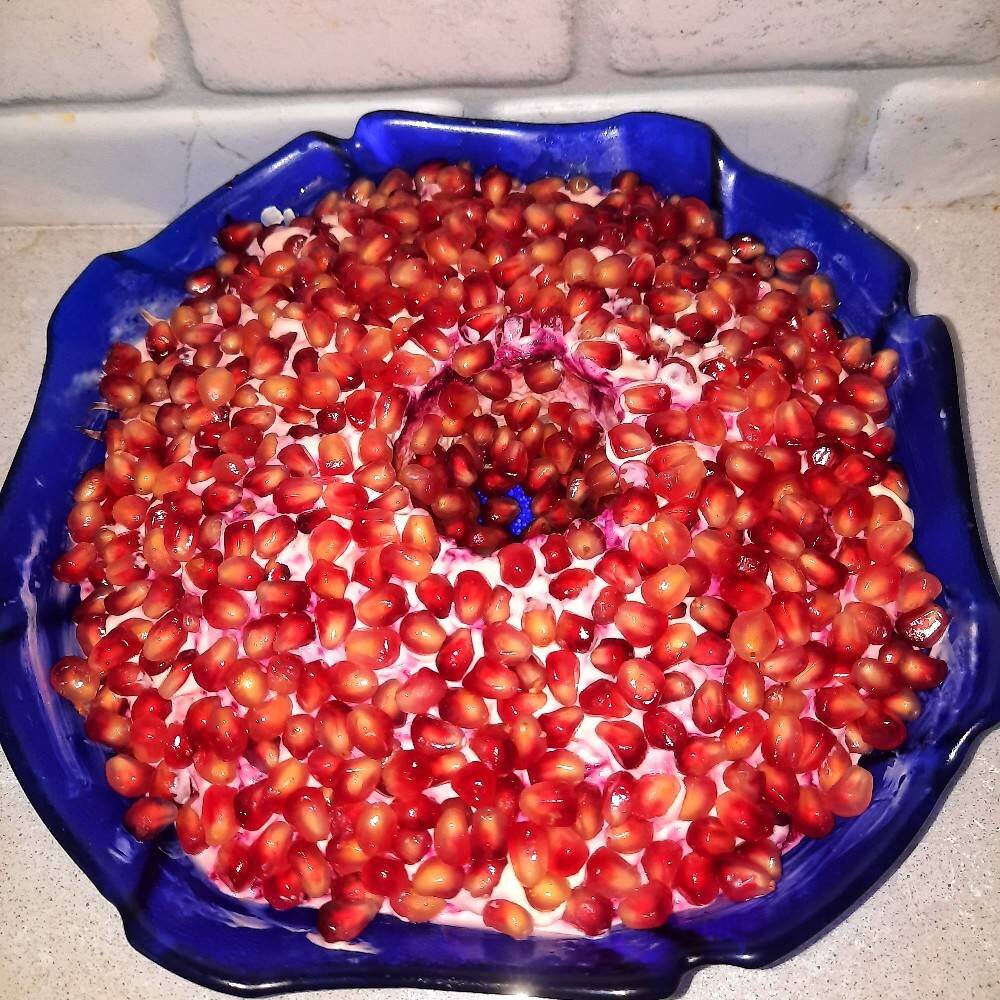 Ингредиенты: - куриное филе, - картофель, - свекла, - морковь, - гранат, - грецкий орех, - майонез, - соль Способ приготовления: Моем и варим овощи Для самой формы салата нам также будет необходим стакан - любой, подходящего диаметра. Куриное филе отвариваем в подсоленной воде, нарезаем кубиками. Все остальные ингредиенты измельчаем на крупной тёрке. Грецкие орехи поджарить и измельчаем ножом или в блендере Гранат очистить. Ставим стакан в центр тарелки и начинаем выкладывать слои салата. 1-й слой: картофель, чуть-чуть соли 2-й слой: курица, майонез 3-й слой: морковь, чуть-чуть соли 4-й слой: грецкие орехи 5-й слой: свекла, чуть-чуть соли, майонез 6-й слой: гранат Приятного аппетита 🍴