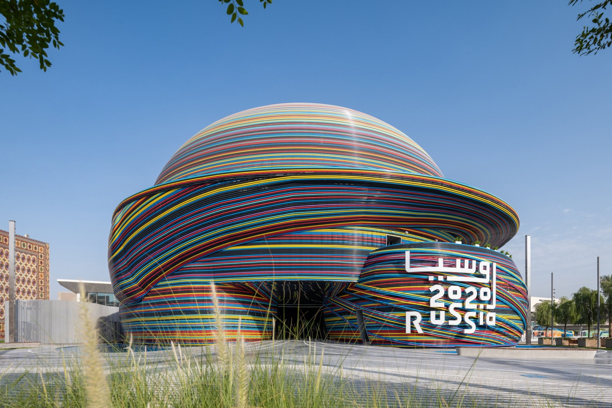 Именно эту тему развивает павильон «Россия», расположенный в квартале «Мобильность». Воплощая образ национального павильона, архитектор проекта Сергей Чобан задался целью передать в композиционном решении здания идею постоянного движения как предпосылки неудержимого поступательного развития, созидания и прогресса. Павильон выполнен в виде двух полусфер, одна внутри другой. Два полушария — это купола, воплощающие образ Планеты Россия и символизирующие целостность и универсальность.