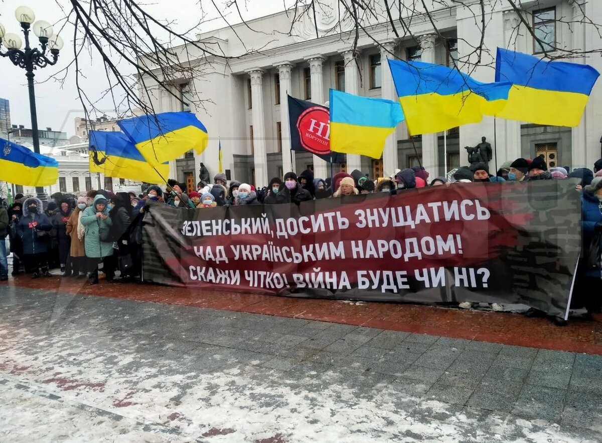 Украинские активисты пришли к Верховной Раде, чтобы донести свою позицию до власти. Плакаты гласят: "Хватит мямлить", "прекрати издеваться над народом" (обращение к Зеленскому) "Мы против войны с Россией", "Нет войне с Россией" и похожими слоганами. Собравшиеся говорят, что им надоело нагнетание обстановки: люди скупают продукты в магазинах и готовятся к войне; пожилые жалуются на проблемы со здоровьем на фоне постоянных новостей из СМИ о возможном нападении России вна Украину.
