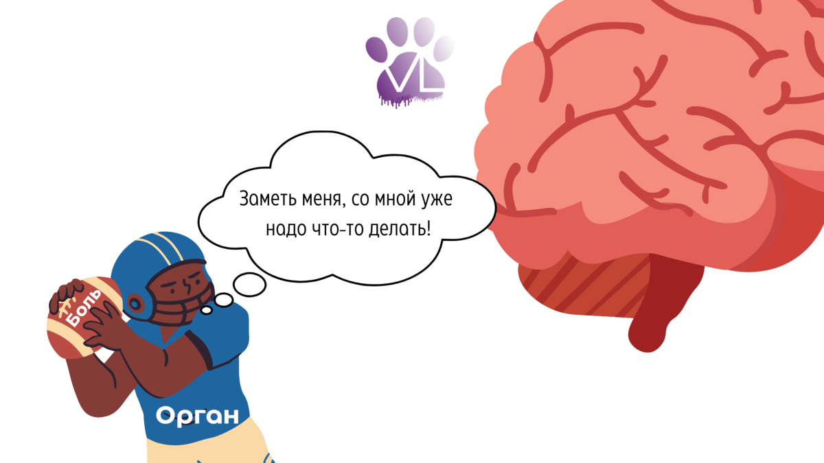Как ветеринарный врач, я вижу свою миссию таковой: профилактировать, исключать, вовремя прекращать боль у животных. Если говорить просто: боль - это сигнал. Не сама патология, а обратная связь тела о болезни, поступающая от конкретного органа/участка тела к мозгу по типу: Возникающая проблема для хозяев и ветеринаров: наши питомцы не многословны. Конечно, есть и другие сигналы о болезненности, но их еще надо уметь распознавать. Собаки и кошки демонстрируют свою боль агрессией при прикосновении к причинному месту, отказом от привычного распорядка дня (сниженный аппетит, нежелание гулять) и прочими косвенными проявлениями. Конечно же, это связано с особенностями образа жизни кошек и собак. Они не могут вокализировать, таким образом привлекая к себе внимание. Поэтому их ухудшение самочувствия приходится считывать, иногда прикладывая неимоверные усилия и оборудование. Первостепенным в деятельности врача остаётся лечение, это абсолютно. И действовать надо, направляя все усилия на источник