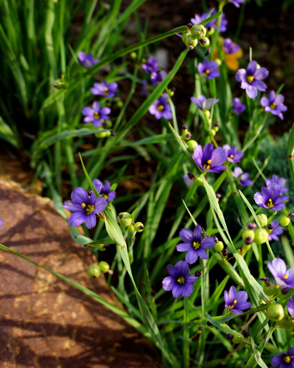 Получив в большом количестве рассадный материал, я стала формировать новые клумбы и бордюры. Сисюринхий простой, не капризный цветок, не требует специального ухода и в любое время его куртины очень декоративны. Очень органично он смотрится среди камней, а так же в компании карликовых можжевельников.