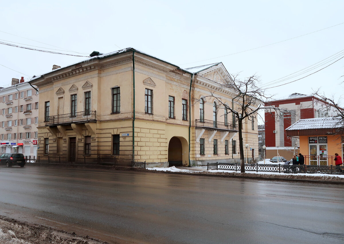 На другой стороне Советской улицы в районе Октябрьской площади обращает на себя внимание нарядное трехэтажное здание, украшенное лепниной и башенками на крыше.
