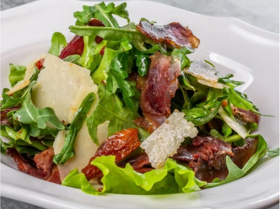 Ингредиенты, г Карп вяленый Карп (целый)…3700 Соль… 500 Сахар… 500 Розмарин свежий …50 Чеснок очищенный …200 Соус к салату Яйцо (желток)… 15 Масло оливковое… 10 Соль… по вкусу Перец черный молотый… по вкусу Лук-сибулет…2 Салат из вяленого карпа Карп вяленый …80 Салат фризе …3 Салат руккола …3 Соус к салату…50 Масло оливковое… 5 Гренки из белого хлеба… 10 Способ приготовления Карп вяленый • Карпа засыпать смесью соли, сахара, свежего розмарина и чеснока. • Мариновать в холодильнике в течение недели. • Очистить от маринада и сушить в течение недели в холодильнике. •Вяленого карпа разделать на чистое филе. Соус к салату • Яичный желток соединить с оливковым маслом, солью, черным молотым перцем и мелко нарезанным луком-сибулетом. Перемешать до однородной консистенции, но не взбивать. Салат из вяленого карпа • Вяленого карпа нарезать тонкими ломтиками и выложить на тарелку. • Украсить листьями салатов фризе и рукколы, полить соусом и оливковым маслом. • Декорировать готовый салат гренками и