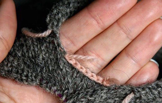 Затем для формирования подрезов между спинкой и передом (или полочками) набираем несколько воздушных петель, т.е. процесс вязания следующий: в первом ряду, в котором нужно отложить петли обоих рукавов и соединить петли спинки и переда, от начала ряда вяжем петли первой детали (например, это полочка), провязываем петли регланной линии, петли первого по ходу вязания рукава переводим на доп. спицы (или булавку) и набираем дополнительные воздушные петли.
