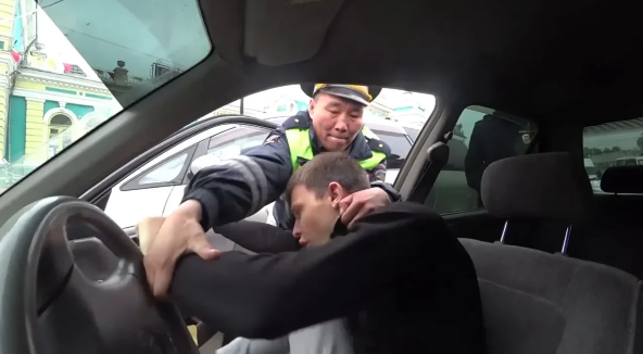 Инспектор останавливает водителя, просит его выйти из машины и пройти к служебной машине для проверки документов.