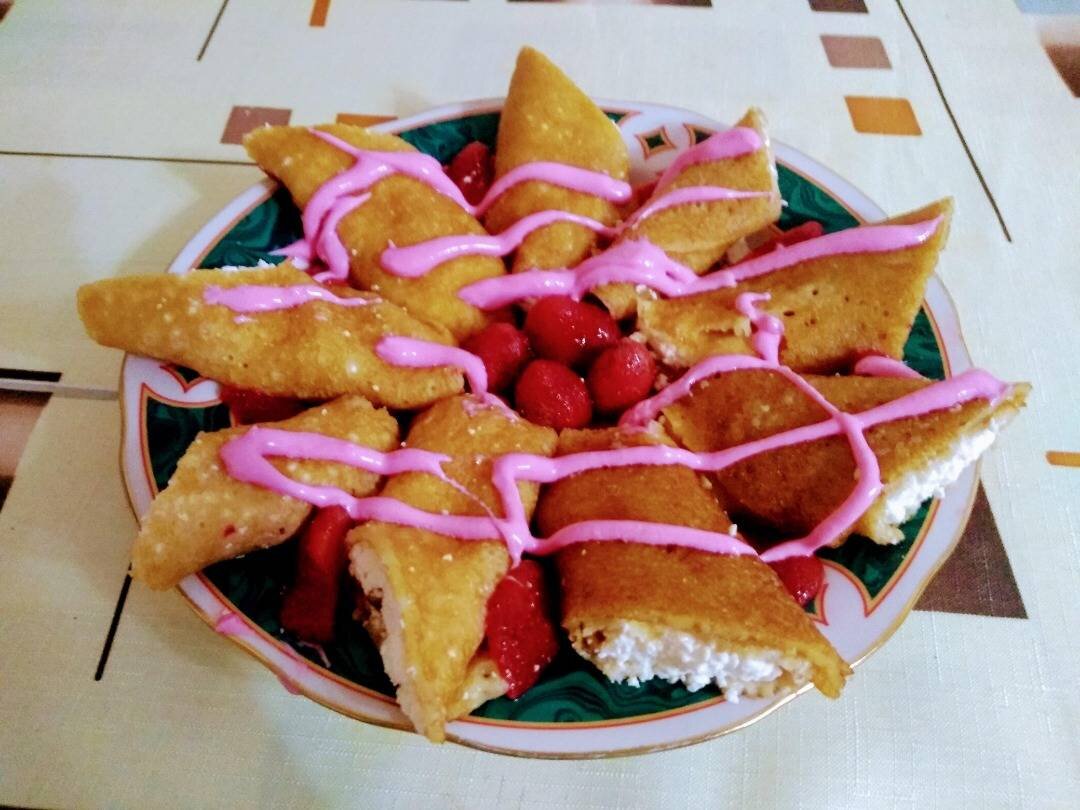#игры #десерт Блинчики получаются очень тоненькие, ажурные, мягкие и вкусные. Одинаково вкусные если готовить их на молоке, кефире, ряженке или простокваше. Приготовлено по рецепту автора IRYNA @MIA_MIA Ингредиенты: Молоко (1 стакан=250 мл), Вода (крутой кипяток), Мука пшеничная, Масло растительное, Сахар, Соль, Сода, Для начинки :, Творог, Сметана 15 %, Сахар, Ванильный сахар, Изюм, Масло сливочное + растительное (для обжарки блинчиков с творогом) Способ приготовления: В миску влейте теплое молоко и положите сахарный песок и соль. Перемешайте. Затем используя сито, просейте муку и соду. Замесите тесто при помощи венчика. Сделайте его однородным по консистенции, чтобы не было явных комочков. Далее разбавьте кипятком, необходимо чтобы вода только что закипела. То есть «заварите» тесто. Сразу же массу размешайте и добавьте растительное масло без запаха. Накройте миску крышкой или пищевой пленкой и дайте тесту постоять хотя бы 10-15 минут, чтобы тесто остыло. Далее очень хорошо разогрейте