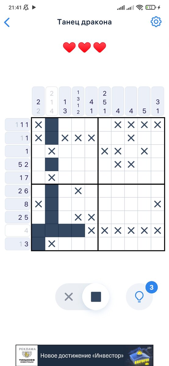 Всём доброго времени чтения. Начнём с первой игры, такой как Nonogram. Com В данной игре нам нужно красить квадратики по номерам, игра на сообразительность и на некоторых уровнях стоит хорошо подумать. За все старания в конечном итоге мы получаем полностью раскрашенную картинку. Проблема с рекламой не так критична, но иногда отвлекает, решается отключением интернета. Как по мне это достойная игра чтобы убить время на много, каждый уровень сложнее но интереснее от этого. В данном жанре это одна из самых лучших, разные события, ежедневные уровни. Вторая игра, очень нашумевшая в тик-токе. Кошки и суп. Это расслабляющая игра с присутствием некой экономики, по типу "накопил - потратил" В данной игре присутствует кастомизация, котов можно одеть. Так же присутствует такие вещи как рыбалка, автомат для вытаскивания всяких полезных вещей таких как, кристаллов и денег. Навязчивой рекламы нет и присутствует она только по желанию, если захотите можете посмотреть рекламный ролик и получить д