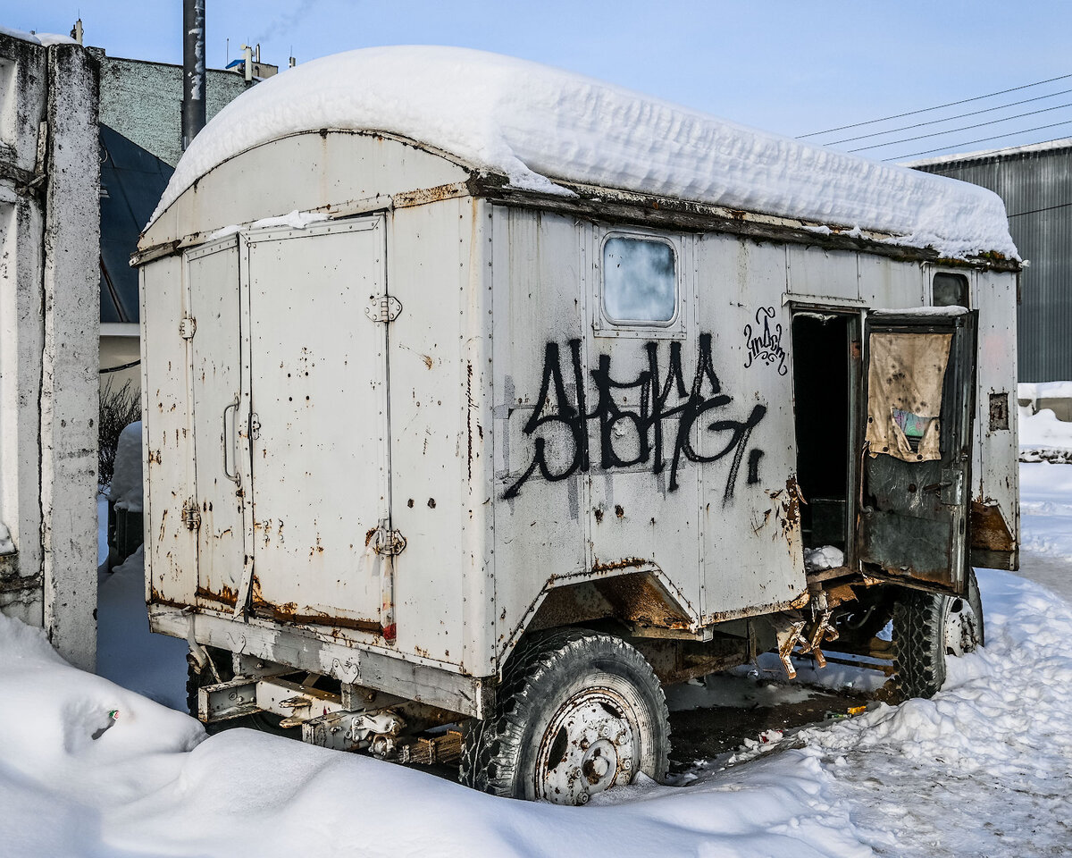 В Коломне возле Патефонки стоит классный грузовой прицеп, из которого можно сделать классный кемпер или передвижной дом на колесах. Не для путешествий, конечно, но для антуража в том же арт-квартале Патефонка. Удивляюсь, как это из него еще не сделали арт-объект или еще что, и стоит он гниет под снегом и дождем. А сделан добротно. Видно, что пытались его доломать местами, но ничего не вышло. Даже дверь оторвать не получилось, только покосилась немного. Впрочем, художники однажды до этого прицепа уже добрались. Об этом свидетельствует специфическая раскраска окошка на двери. Пусть и со стороны улицы, а не изнутри. Внутри все полностью разрушено и снимать абсолютно нечего. Но пространства достаточно для разных целей. В общем, стоит прицеп и гниет, хотя мог бы приносить пользу. Думаю, что кому-нибудь на участке тоже пригодился в качестве временного домика. Вон то отверстие в стене явно предназначено для трубы "буржуйки". Но там рядом какая-то организация и, скорее всего, стоит этот прицеп