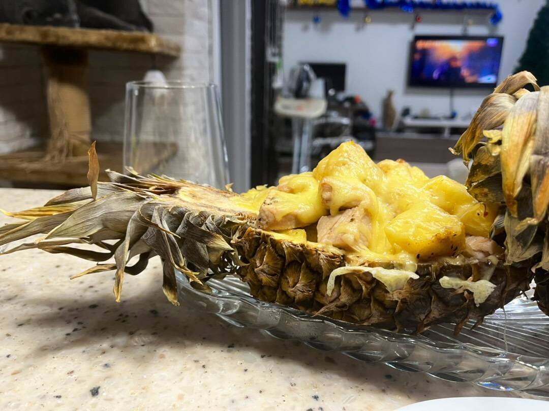 Ингредиенты: средний ананас🍍, филе индейки, специи, сыр Способ приготовления: Ананас помыть, разрезать пополам. Мякоть ананаса и филе индейки нарезать крупным кубиком. Индейку обжарить до полуготовности в сковороде, затем добавить кубики ананаса и специи. Ещё немного потомить. Затем выложить содержимое в подготовленные емкости из ананаса, обильно посыпав сыром и запечь при 180* до красивой румяной корочки. Приятного аппетита!!!