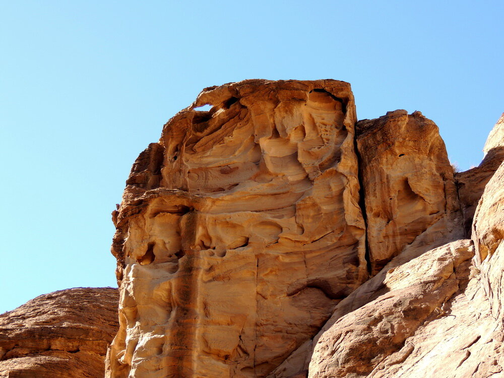 Каньон Сик узкий с попадающимися расширениями. Скалы высокие и необычной формы. Поэтому речь пойдет о наиболее необычных скалах и объектах. В прошлых публикациях по каньону Сик, ведущему в Петру, я рассказал о магическом камне и о системе водоснабжения древней Петры. Что еще интересного встретилось по пути к этому затерянному во времени и пространстве городу? 1. Необычная скала Эта скала встретилась нам одной из первых на пути. Она возвышается немного в стороне от скал прохода и выглядит как рукотворное ажурное строение. На самом деле ветер и вода сделали ее как бы вылепленной из глины. Необычность дополняет ее цвет. 2. Влюблённые скалы Мы шли по каньону. Вдруг гид остановился и предложил посмотреть, что осталось у нас за спиной вверху. Я повернулся и был поражен такой работой природы. Две целующиеся скалы в виде мужчины и женщины застыли в вечности. Как будто злой волшебник превратил живых людей в камень. Дальше полёт фантазии. Вы и сами, надеюсь, сможете нафантазировать о том, как в