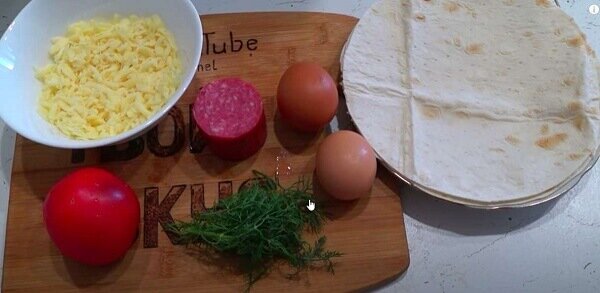 Сегодня мы будем готовить завтрак на скорую руку. Быстрый и простой завтрак за 5 минут. Итак, что нам для этого понадобится. Лаваш два листа отрезаем их тарелкой, чтобы они были круглой формой. Как это делается. Берём лаваш сверху ложем тарелку к верху дном и отрезаем ножом всё лишнее, выступающее за края тарелки. Сыр твердый натёртый на терке 100 грамм Колбаса копчёная 60 грамм, один помидор, укроп маленький пучок и два сырых яйца. Итак, приступим. Подготовим наши продукты, нарежем колбасу. Также нарежем помидор ломтиками, и мелко нарежем укроп. Далее берём сковородку и ставим на небольшой огонь. Наливаем немножко растительного масла и кладём лаваш. Далее разбиваем яйца. Немного подсаливаем солью. Дальше выкладываем колбасу, помидор добавляем половина укропа и сыра. Затем закрываем второй половинкой лаваша. Закрываем крышкой и готовим пять минут с одной стороны. Пять минут прошли, снимаем крышку и ложем на другую сторону. Раскладываем равномерно сверху сыр и укроп, что остался. Закрыв