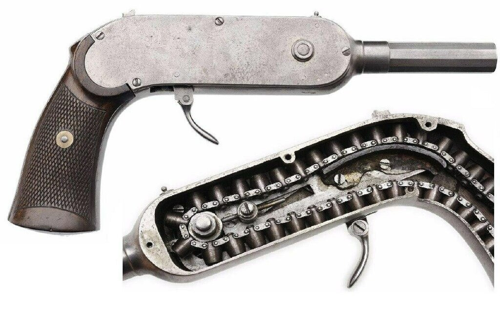 Цепной пистолет Гайкота. Французский инженер Полен Гэй и его компаньон А. Гено в 1879 году получили сразу два патента (в Англии и Германии) на оружие, которое известно, как игольчатый цепной пистолет Гайкота. В конструкцию пистолета входили металлическая рамка, закрытая с двух сторон крышками, ствол калибра 6 мм и рукоятка с деревянными накладками. Рамка с рукояткой пистолета были полыми, а внутри располагалась цепь на 40 зарядов, с направляющими роликами и натяжным механизмом. Перезарядка цепи осуществлялась через отверстие в верхней части рамки, закрываемое крышкой. При нажатии на спусковой крючок, цепь проворачивалась, ствол двигался назад и камера цепи со особой пулей, в полости которой содержался заряд, входила в патронник, обеспечивая обтюрацию. При дальнейшем нажатии на спусковой крючок ударник накалывал метательный заряд и происходил выстрел. После отпускания спускового крючка ствол возвращался на место. Весь процесс мог повторяться до полного израсходования боеприпасов. Пис