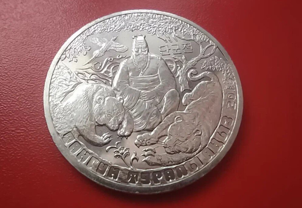 Есть у меня одна красивая монетка из серии "Сказки народов Казахстана". Я уже писал про монеты в честь сказок разных народов, которые живут на территории Казахстана, и вот теперь еще про одну монету. Как я понимаю, она посвящена корейцам, которые живут в Казахстане. Монета в честь легенды про Тангуна. Кто такой Тангун я не то что понятия не имею, я даже ранее не слышал про такого персонажа. Оказывается, это основатель государства Кочосон, которое является первым корейским образованием. На этом изображении вы можете его видеть: Именно так оформлен реверс монеты. Вы можете видеть легендарного Тангуна, который сидит под сандаловым деревом. Внизу находится надпись полукругом на казахском языке ТАНГУН ТУРАЛЫ АҢЫЗ, а рядом с Тангуном надпись на корейском языке (я сличил, там написано по-корейски Тангун). Этой надписью на корейском языке символизируется "корейская составляющая" монеты. Но зачем на монете изображены тигр и медведь? Всё дело в том, что они являются персонажами "Легенды о Тан