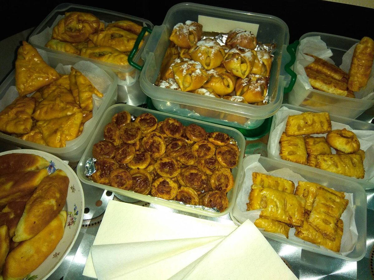 Ушли в прошлое традиции отмечать дни рождения на работе. А где сохранились, то весьма видоизменились. У сына на работе принято покупать на 2 отдела 3 торта и ускоренном режиме чаевничать в обед. Но!! Так как преимущественно сотрудники – это мужчины, то тортики как-то не очень впечатляют…Стало проще заказывать несколько пицц. Конечно, всё это символически. Я решила разнообразить меню и угостить его коллег домашней выпечкой. Забегая вперед, могу сказать, что всё ушло на троекратное «Ура»)) Старалась все подготовить такое, чтобы поменьше марались руки, и было удобно для транспортировки, учитывая вкусы: мясо, рыба, сладкое. Все оказалось не так страшно, как кажется. Все привычные рецепты, может, несколько подкорректированные под себя. Например, плюшки ТИПА самсы. Рецепт здесь Параллельно поставила дрожжевое тесто быстрое, которое подходит за 1 час. Приготовила мою любимую начинку: обжарила капусту с луком, морковью и грибами, потом дотушила. Пока остывает одно, делаешь что-то другое. Без