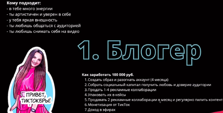 1. Блогер. - Создать образ и разогнать аккаунт, (4 месяца). - Собрать социальный капитал и получить любовь и доверие аудитории. Если у тебя есть миллион аудитории то ты можешь сделать миллион рублей за день продав какой то товар. - Продать 1-4 рекламных коллаборации. - Упаковать их в кейсы. Показать их рекламодателю. - Продавать 2 рекламных коллаборации в месяц и регулярно пилить контент. - Монетизация от тик ток. Если ты автор, делающий образовательный контент и соответствующий правилам сообщества, то тик ток будет тебе платить 30-60 тыс рублей. - Доход в эфирах. Стримы игр, интересные лекции и истории. За это можно получать донат. Зарабатывать на рекламе можно от 3 тысяч подписчиков, но при этом главное охваты, они важнее всего. Кому подходит: -в тебе много энергии -ты артистичен и уверен в себе -у тебя яркая внешность -ты любишь общаться с аудиторией -ты любишь снимать себя на видео 2. Амбассадор бренда Стал крутым блогером, продал душу бренду. В своем блоге использует только пр