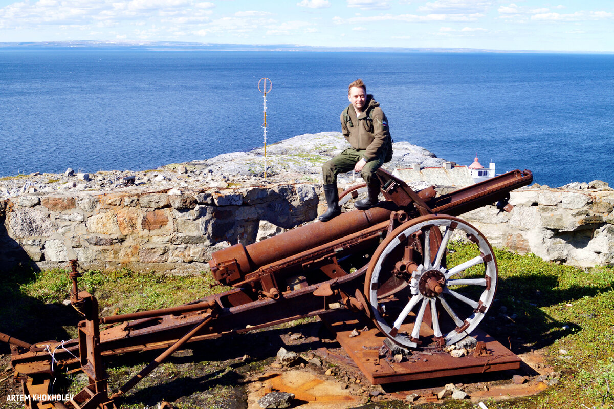 с выводком куропаток, почти до кондрашки перепугавших автора, выскочив у него из-по сапог в глухом ущелье. Примерно за километр до батареи стали попадаться следы войны в виде колючей проволоки, повалившихся телефонных столбов, блиндажей, зенитных и прожекторных позиций и ржавого хабара. Долгожданный вид на три орудия, здания маяка и Варяжский залив не мог не радовать после долгого похода.