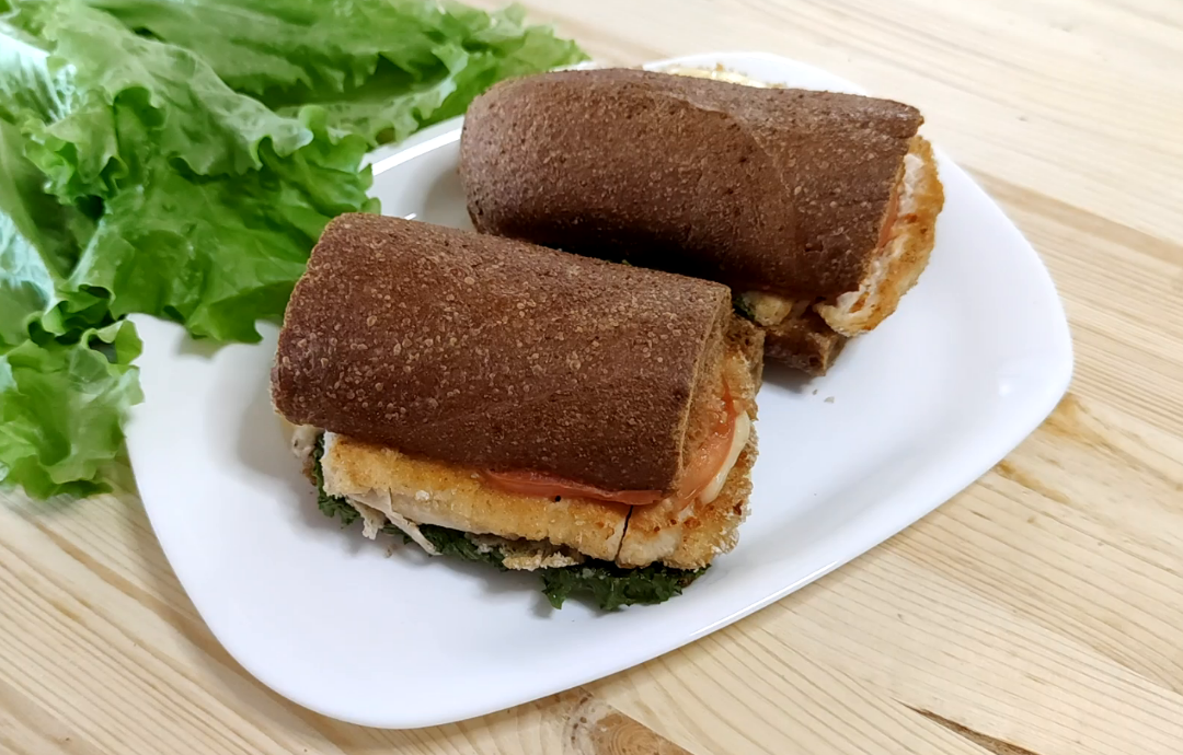 Вкусный, сытный, сочный, а главное, быстрый в приготовлении сэндвич с курицей и сыром. Отлично подойдет в качестве завтрака или перекуса. Ингредиенты: Куриное филе, Сыр твердый, Помидор, Листья салата, Майонез, Кетчуп, Багет/Чиабата Способ приготовления: Куриное филе разрезать на 2 части. Затем с двух сторон отбить, посолить и поперчить. Каждую половинку филе панируем в муке, затем яйце и панировочных сухарях. Обжариваем с двух сторон до готовности и золотой корочки. Разрезаем багет/чиабату на поперек на порционные куски и смазываем соусом из кетчупа и майонеза (их просто нужно смешать). Далее разрезаем готовое филе на части и собираем наш сэндвич в следующем порядке. Багет, лист салата, сыр, курица, сыр, помидор, багет. Сэнвдич можно есть, а можно отправить в духовку на 5 минут чтобы расплавился сыр. Это поможет стать сэндвичу более сочным и сырным. Видео рецепта -