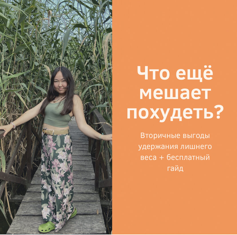 Вторичные выгоды + бесплатный гайд В прошлой статье я поделилась очень личной психологической причиной набора веса. Но может быть и такое, что осознавать свои причины - недостаточно. Нужно разобрать вторичные выгоды оставаться в лишнем весе. Звучит бредово, но выгод именно в этой сфере больше всего. Вторичные выгоды - это скрытая польза от проблемы. Приведу ниже несколько примеров, которые назвали мои доверители: 1)Лишний вес защищает от изнасилования 2)Лишний вес привлекает внимание, могут жалеть 3)Человека с лишним весом не будут заставлять работать на огороде 4)Лишний вес поможет противостоять мужу 5)Лишний вес защитит от нежелательной беременности Вторичных выгод очень много! У меня есть бесплатный гайд с топ20 причин лишнего веса. Напишите мне в Инстаграм @zubtsova.karina и получите его совершенно бесплатно