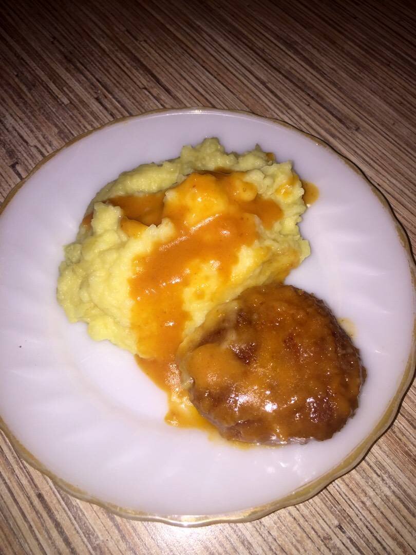 Ингредиенты: куриного филе, луковицы, специи, соль, картошка, Подлива, Сметана , Томатная паста , Мука, Вода, Морковь, Лук Способ приготовления: Грудку перекрутить в мясорубке (блендере) с луком и 1 сырой картошкой, добавить соль специи, хорошо перемешать.. Мокрыми руками сформировать котлетки и обвалять в сухарях (муке) выложить в хорошо разогретое масло и обжарить до румяной корочки с каждой стороны. Котлеты перекладываем на тарелку.. В этом же масле обжариваем морковь и лук, в чашке смешиваем воду /сметану /пасту/муку чтоб не было комочков.. Выливаем к зажарке, доводим до кипения.. выкладываем котлетки, уменьшаем огонь на минимум и под крышкой тушим 20-30 мин. Приятного аппетита!!!