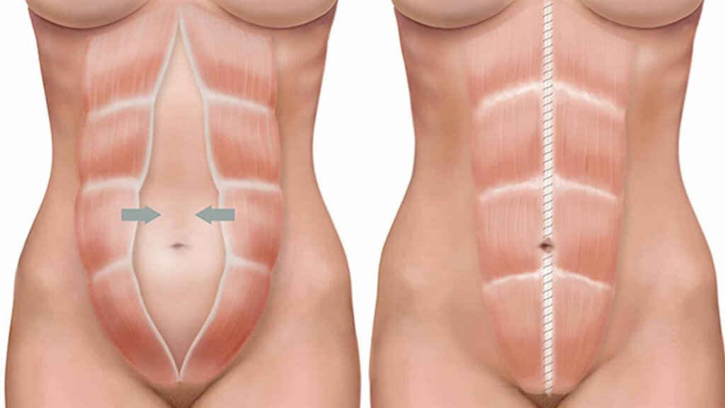 Как это устроено? Мышечный слой состоит из четырех парных мышц. Это внутренние и внешние косые мышцы, вертикально ориентированные прямые мышцы живота, горизонтально ориентированные поперечные мышцы. Влагалище прямых мышц живота – это сухожильный футляр, который образуется из апоневрозов поперечных и косых мышц. Прямые мышцы, тонкие и широкие в верхней части, в нижней становятся толстыми и узкими. В середине живота апоневрозы сходятся в белую линию, которая тянется до лонного сочленения от мечевидного отростка. Это трехмерная сеть коллагеновых волокон, которые ориентированы наискось и поперек. Расположение коллагеновых волокон во внутренней зоне белой линии нерегулярно. Передняя брюшная стенка остается стабильной благодаря влагалищу прямой мышцы и белой линии. Она может растягиваться вширь. И когда стенка растягивается слишком широко, развивается диастаз прямых мышц живота (ДПМ). Вопрос нормы до сих пор остается объектом споров. Раньше считалось, что расстояние между передними мышцами